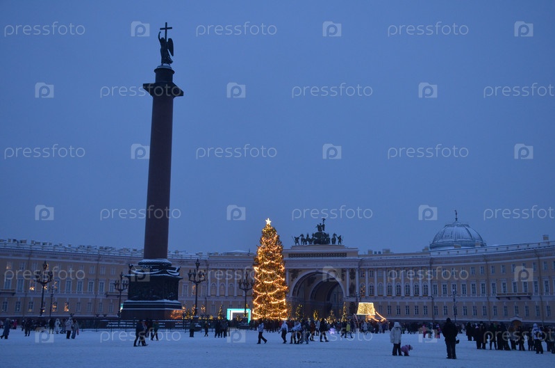 Новогодняя ель на заснеженной Дворцовой площади в Санкт-Петербурге: Александровская колонна (Александрийский столп) и здание Главного штаба
