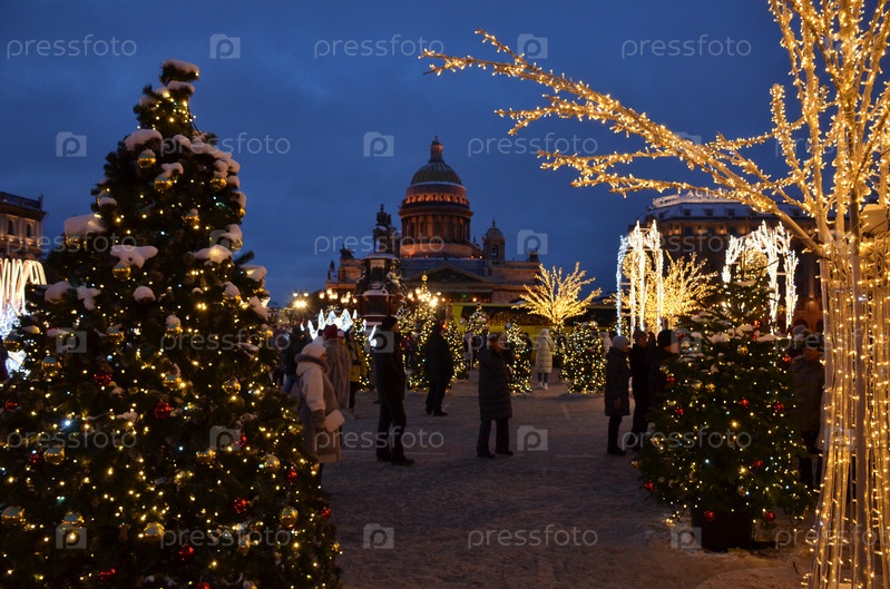Вид на Исаакиевский собор на фоне новогодних украшений зимнего сада на Синем мосту через реку Мойка в Санкт-Петербурге