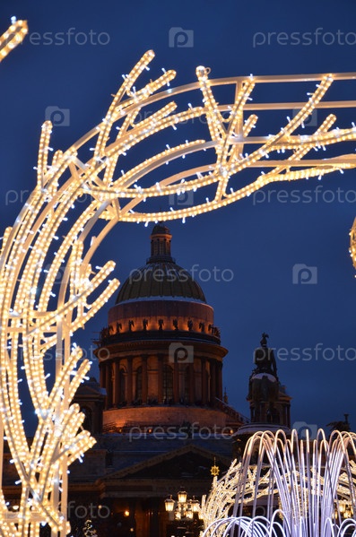 Вид на Исаакиевский собор и памятник царю Николаю I на фоне новогодних украшений зимнего сада на Синем мосту через реку Мойка в Санкт-Петербурге
