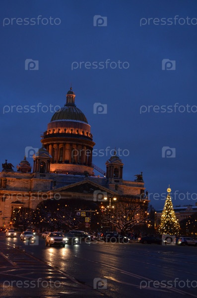 Вид на Исаакиевский собор и новогоднюю ель на Исаакиевской площади