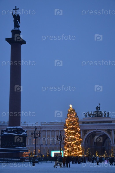 Новогодняя ель на заснеженной Дворцовой площади в Санкт-Петербурге: Александровская колонна (Александрийский столп) и здание Главного штаба