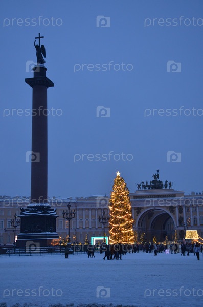 Новогодняя ель на заснеженной Дворцовой площади в Санкт-Петербурге: Александровская колонна (Александрийский столп) и здание Главного штаба