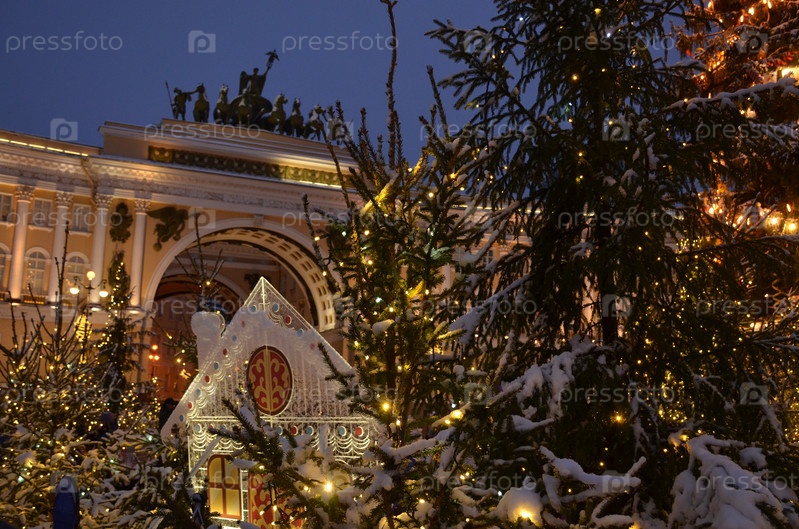 Вид на арку Главного штаба Эрмитажа на фоне новогодней ели и праздничных декораций на Дворцовой площади в Санкт-Петербурге