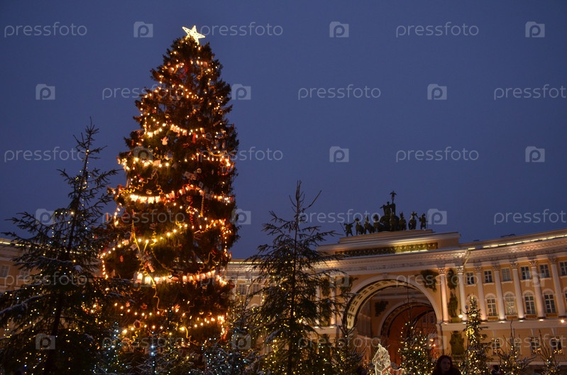 Вид на арку Главного штаба Эрмитажа на фоне новогодней ели и праздничных декораций на Дворцовой площади в Санкт-Петербурге