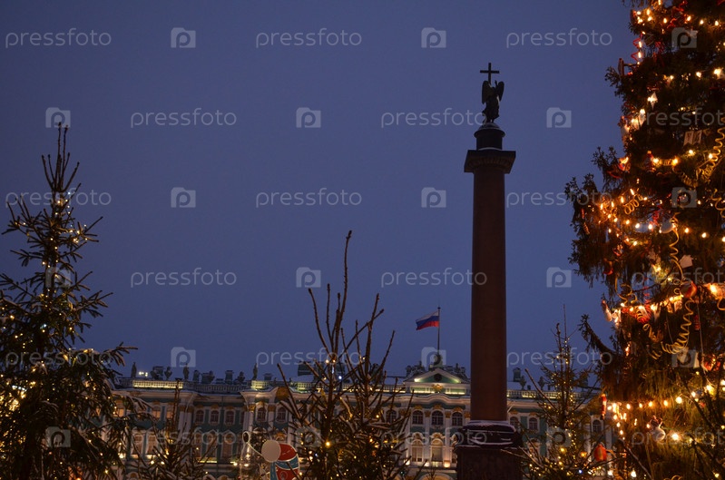 Вид на Зимний дворец (Эрмитаж) и Александровскую колонну (Александрийский столп) на фоне новогодней ели и праздничных декораций на Дворцовой площади в Санкт-Петербурге