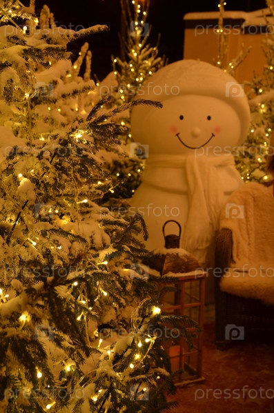 Новогодняя инсталляция (композиция, фотозона) в отеле Glinz в Санкт-Петербурге, Петроградский район: снеговик, фонарь и елки в светящихся гирляндах