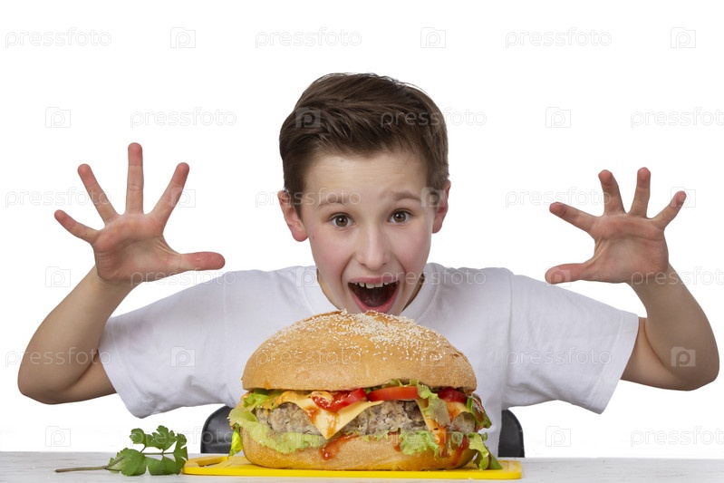 Молодой эксцентричный мальчик с большим гамбургером, изолированный в белом. Подросток показывает хороший аппетит