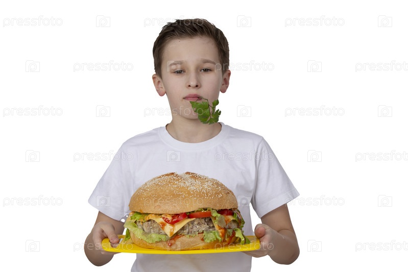 Мальчик с большим гамбургером, изолированный в белом. Подросток держит бургер и пучок петрушки