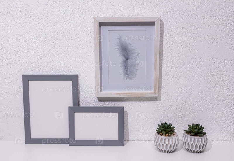 Стильный минималистский декор в светлых тонах на белом столе в современном пространстве. Две серые фоторамки, картина, горшки. Вид спереди. Эко-предметы