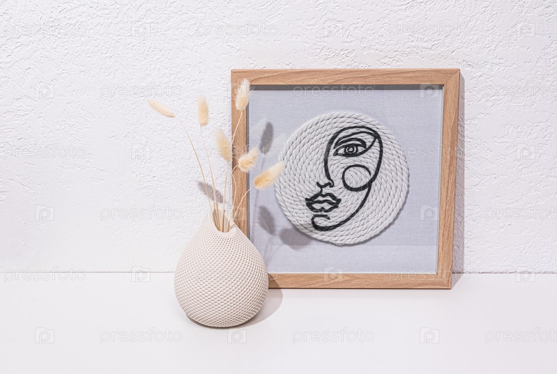 Стильная современная картина на белой поверхности стола или комода с вазой с засушенными цветами лагуруса. Декор для дома в белых тонах