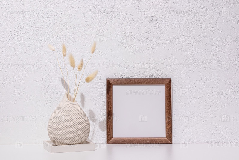 Домашний интерьер с элементами декора. Макет с деревянной рамой, сухие цветы в вазе на светлом фоне. Вид спереди. Концепция комнаты в стиле минимализма