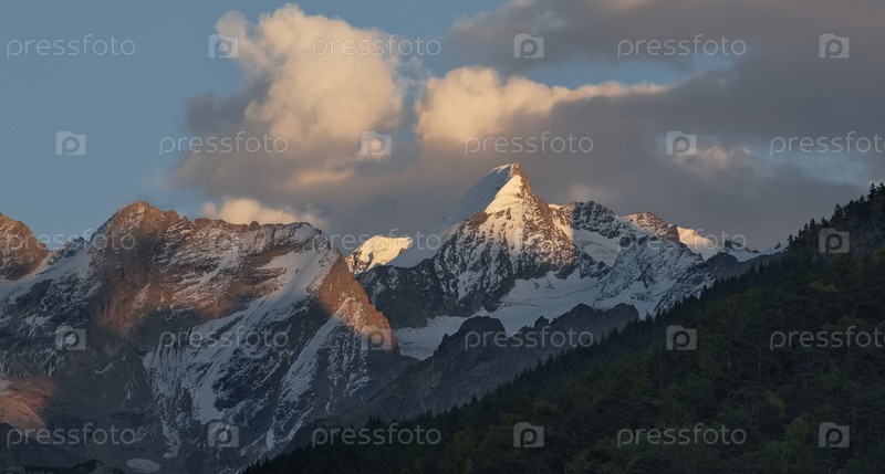 Россия. Кабардино-Балкария. Вид на заснеженные вершины Кавказских гор на закате осеннего дня