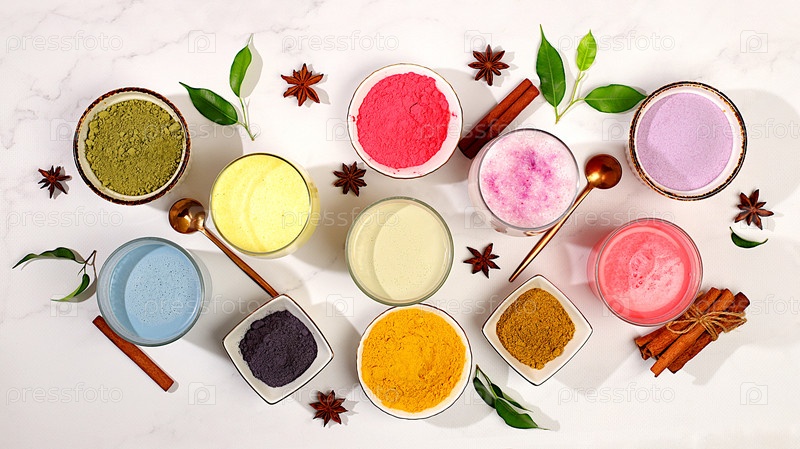 Различные латте матча с молоком на светлом фоне и порошком матча в чашках. Традиционный индийский модный напиток, богатый антиоксидантами, используется для похудения и лечения