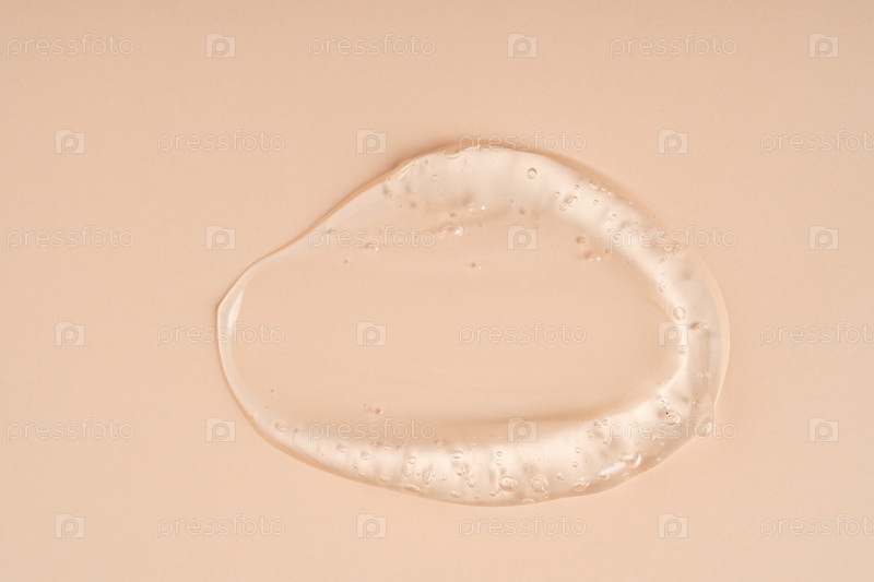 Косметический гель или сыворотка желе красоты текстура фон. Прозрачный уход за кожей коллагеновый продукт фон. Антибактериальный дезинфицирующее средство или жидкий водный увлажняющий тонер размазанный мазок, бежевый фон