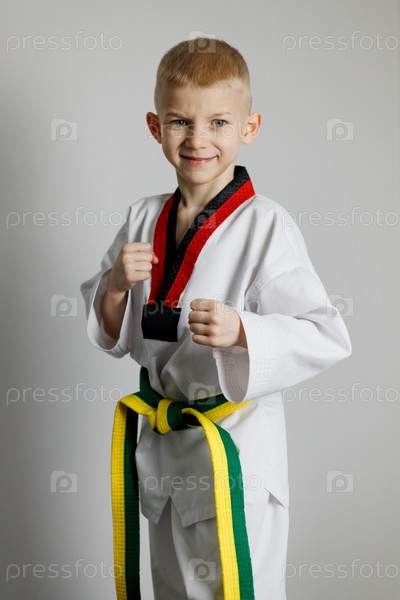 Мальчик в форме тхэквондо улыбается и демонстрирует боевую позу. Серьезный взгляд в камеру