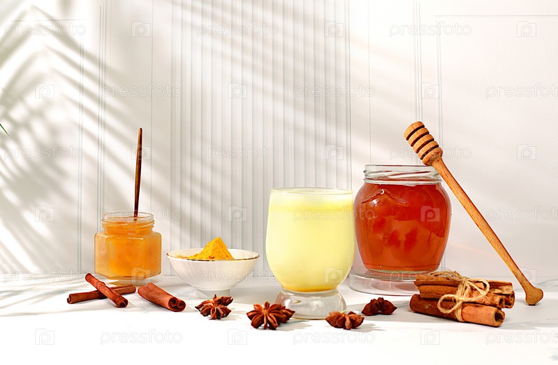 Золотой латте с куркумой, имбирем, корицей, анисом и медовыми специями на солнечном столе. Концепция потери веса и альтернативной медицины, усилитель иммунитета во время пандемии, реклама индийской кухни
