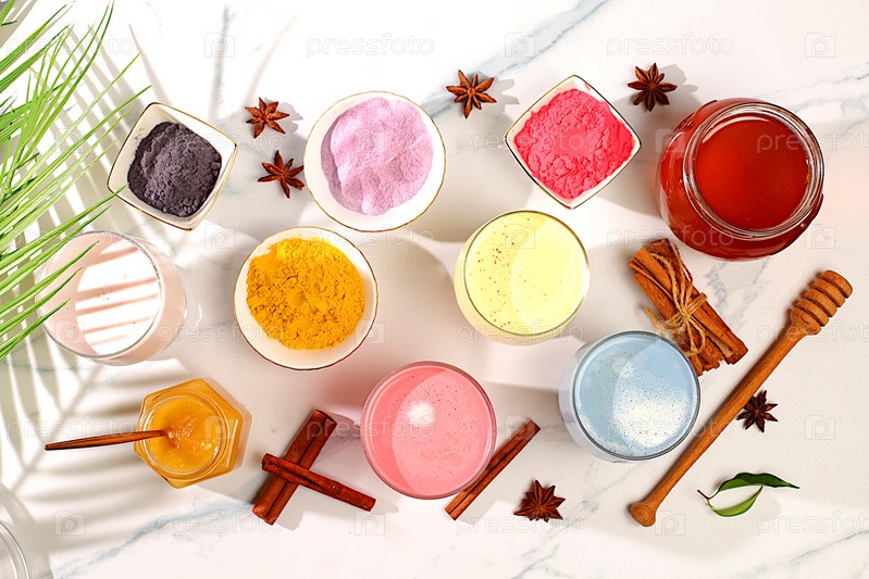 Ассортимент красочных матча латте, японский чай, золотистая куркума, лавандово-голубое и розовое лунное молоко. Модный полезный напиток способствует снижению веса, расслабляющий напиток перед сном