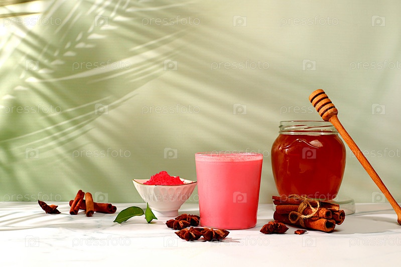 Розовое лунное молоко матча латте с корицей, анисом и медовыми специями на солнечном столе. Концепция потери веса и альтернативной медицины, расслабляющий напиток перед сном и повышение иммунитета, реклама индийской кухни