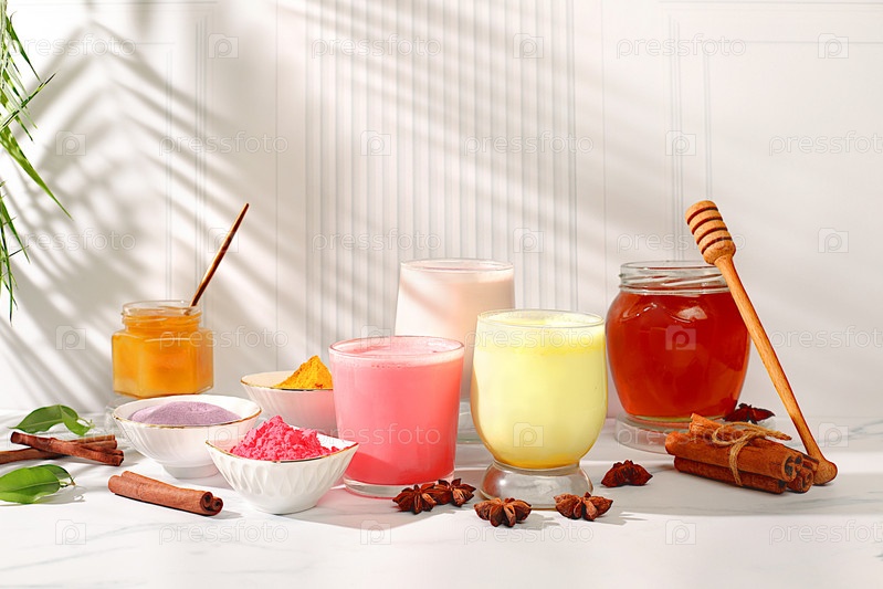 Разнообразие красочных матча латте, японский чай, золотистая куркума, лавандово-голубое и розовое лунное молоко. Модный полезный напиток способствует снижению веса, расслабляющий напиток перед сном
