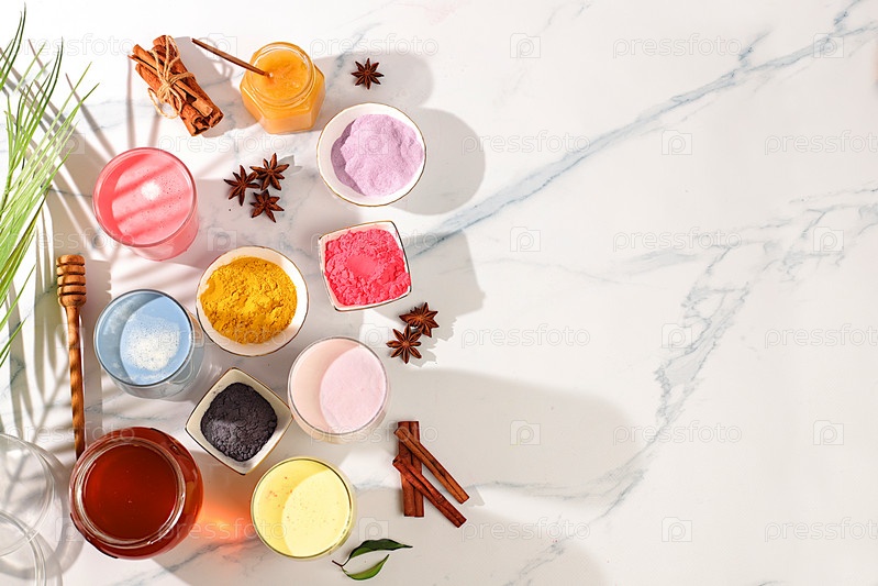Ассортимент красочных матча латте, японский чай, золотистая куркума, лавандово-голубое и розовое лунное молоко. Модный полезный напиток способствует снижению веса, расслабляющий напиток перед сном