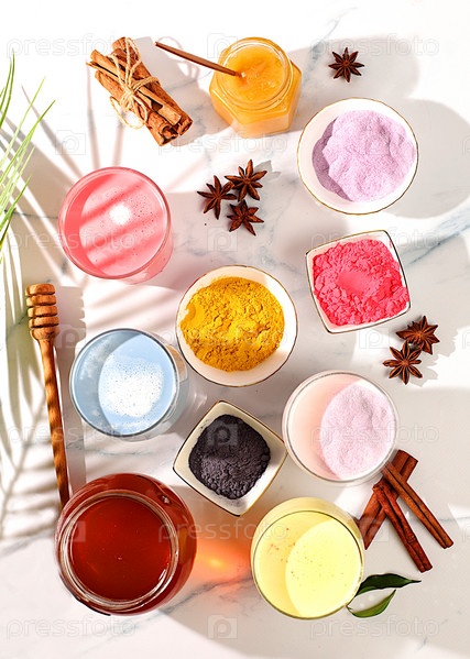 Ассортимент красочных матча латте, японский чай, золотистая куркума, лавандово-голубое и розовое лунное молоко. Модный полезный напиток способствует снижению веса, расслабляющий напиток перед сном