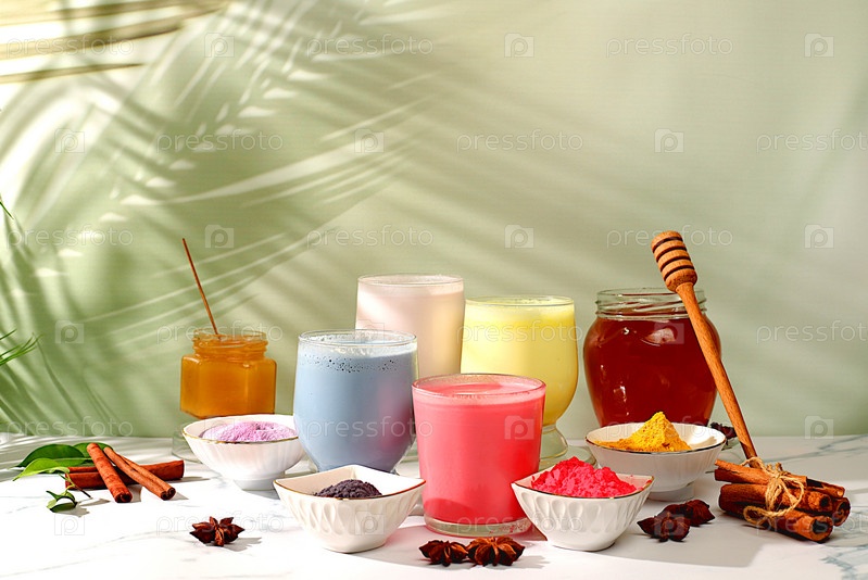 Ассортимент красочных матча латте, японский чай, золотистая куркума, лавандово-голубое и розовое лунное молоко. Модный полезный напиток способствует снижению веса, расслабляющий напиток перед сном