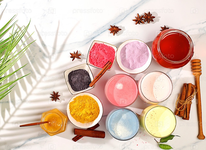 Ассортимент красочных матча латте, японский чай, золотистая куркума, лавандово-голубое и розовое лунное молоко. Модный полезный напиток способствует снижению веса, расслабляющий напиток перед сном