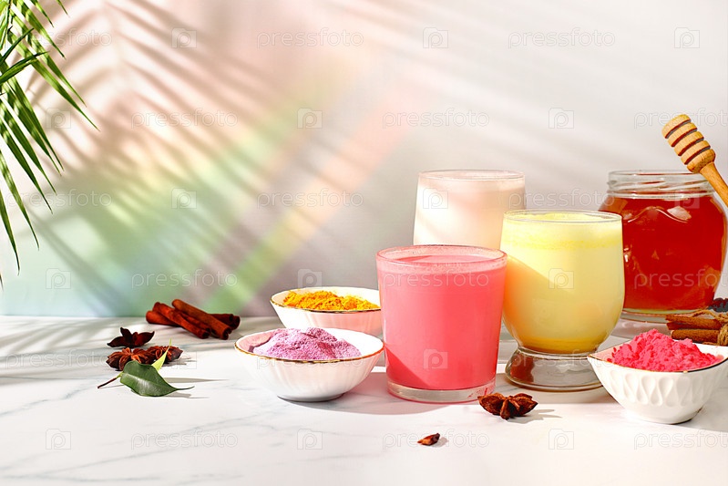 Ассортимент красочных матча латте, японский чай, золотистая куркума, лавандово-голубое и розовое лунное молоко. Модный полезный напиток способствует снижению веса, расслабляющий напиток перед сном