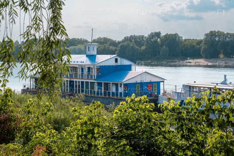 Павлово, Нижегородская область, Россия - 17.07.2024. Пристань с туристическим катером, река Ока