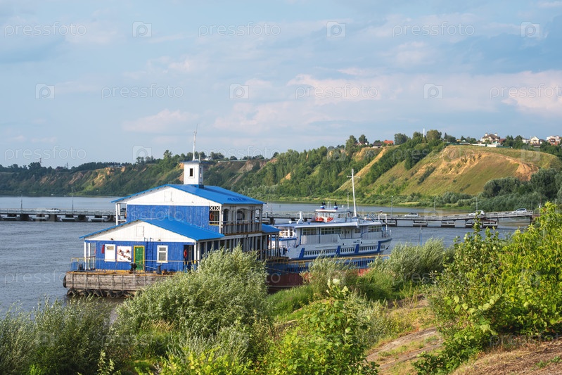 Павлово, Нижегородская область, Россия - 17.07.2024. Пристань с туристическим катером, река Ока
