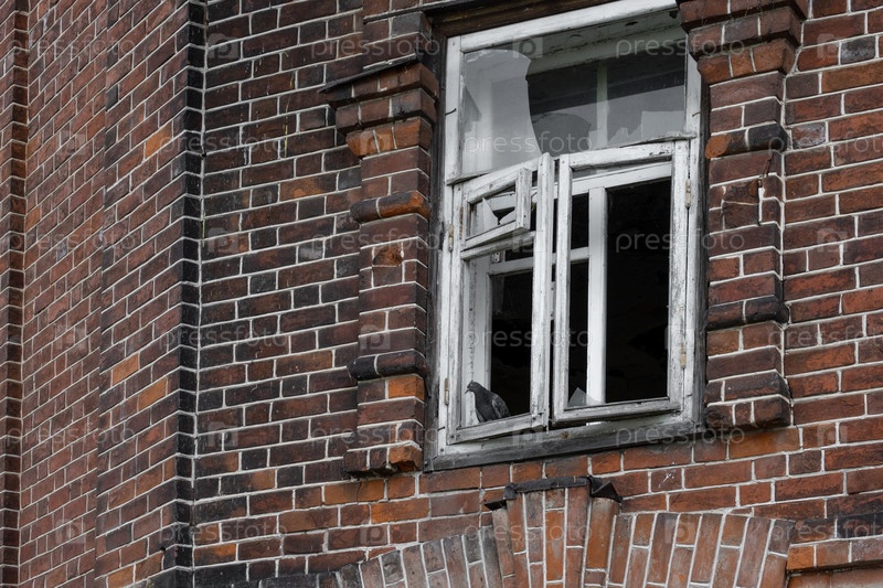 Фрагмент кирпичной стены и разбитое окно старого заброшенного дома