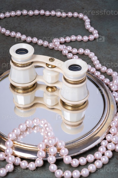 Бинокль стоит на зеркале, окруженном жемчужными ожерельями