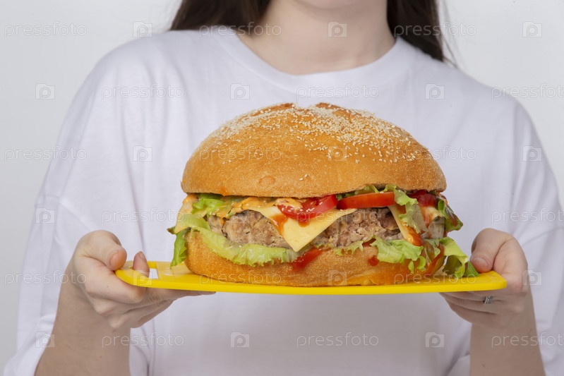 Руки держат поднос с большим бургером
