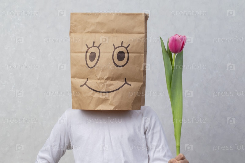 Ребенок с картонной коробкой на голове, на которой маркером нарисована улыбка, он держит тюльпан. Концепция покупки подарков к празднику