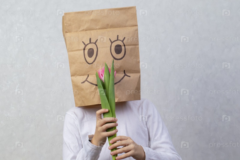 Ребенок с картонной коробкой на голове держит тюльпан. Концепция анонимного подарка
