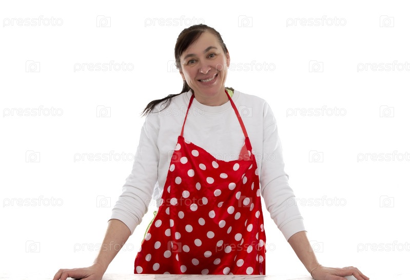 Женщина средних лет в кулинарном фартуке в красный горошек на белом фоне