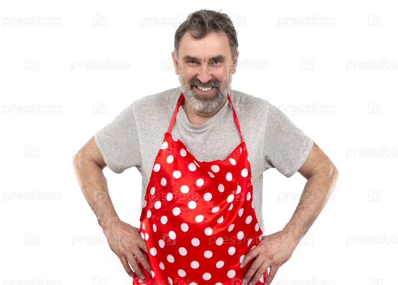 Пожилой бородатый мужчина в красном кулинарном фартуке в горошек на белом фоне