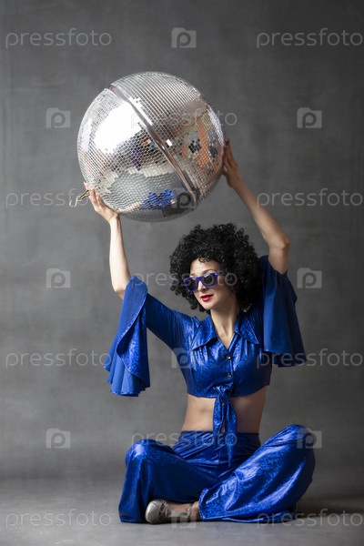 Женщина в расклешенном костюме семидесятых с диско-шаром в афро-парике на сером фоне