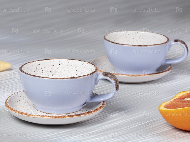 Пустые керамические синие чашки с блюдцами на сером фоне