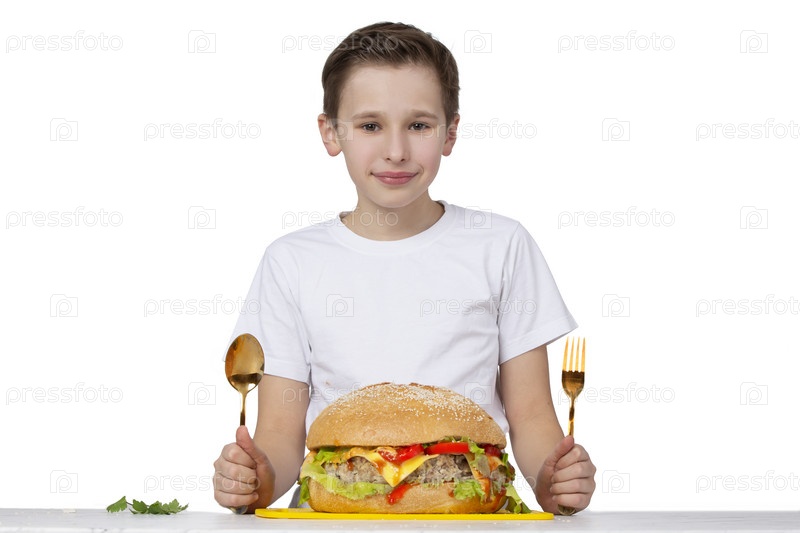 Мальчик с большим гамбургером, изолированный в белом. Подросток держит золотую вилку и ложку