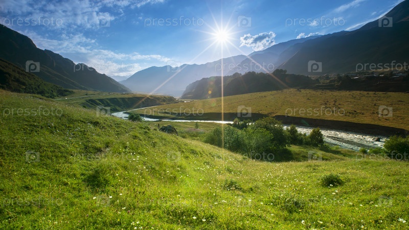 Красивый вид на горы, освещенные солнцем летом. Грузия, Европа. Кавказские горы