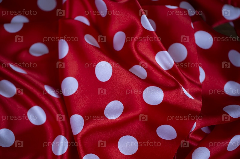 Красная шелковая ткань с крупным белым горошком. Фон в горошек