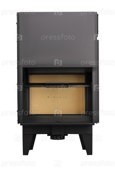 Современные камины для отопления из металла и жаропрочного стекла. Котел на твердом топливе изолирован на белом фоне