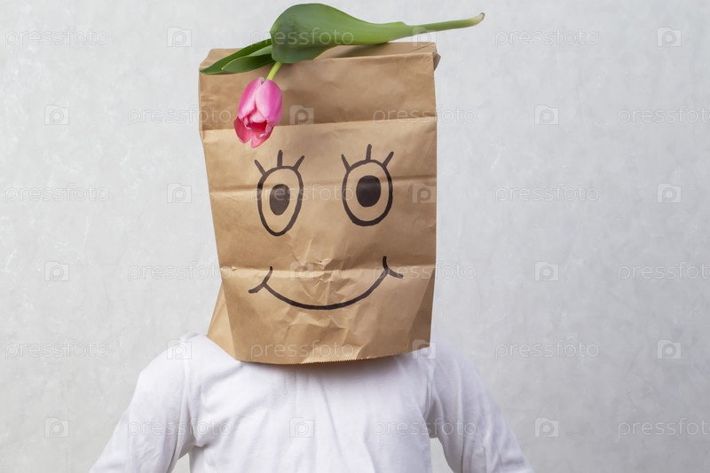 Смешной мальчик надел себе на голову бумажный пакет с нарисованной улыбкой и положил на него тюльпан. Концепция анонимного подарка