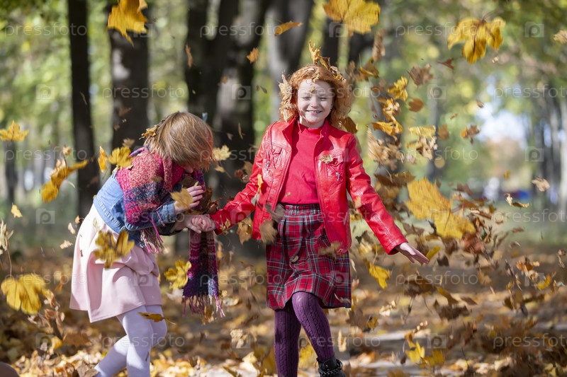Счастливые дети играют в осеннем парке теплым солнечным осенним днем