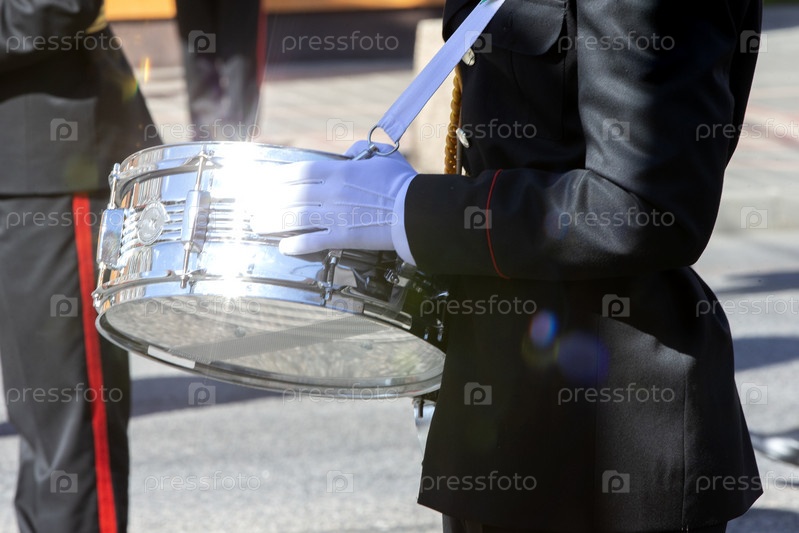 Серебряный барабан в руках музыканта военного оркестра сверкает на солнце