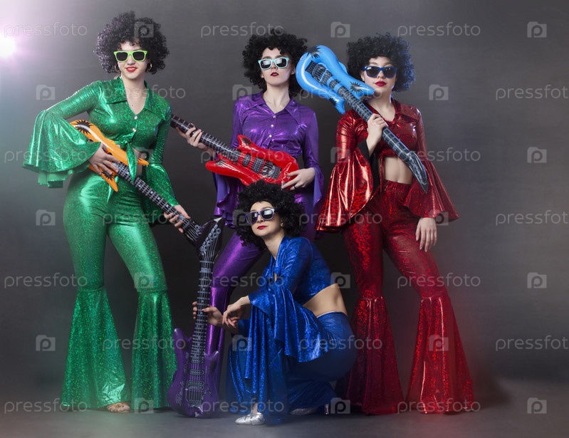 Девушки в ярких блестящих костюмах и париках с гитарами. Винтажная музыкальная диско-группа для женщин в стиле диско