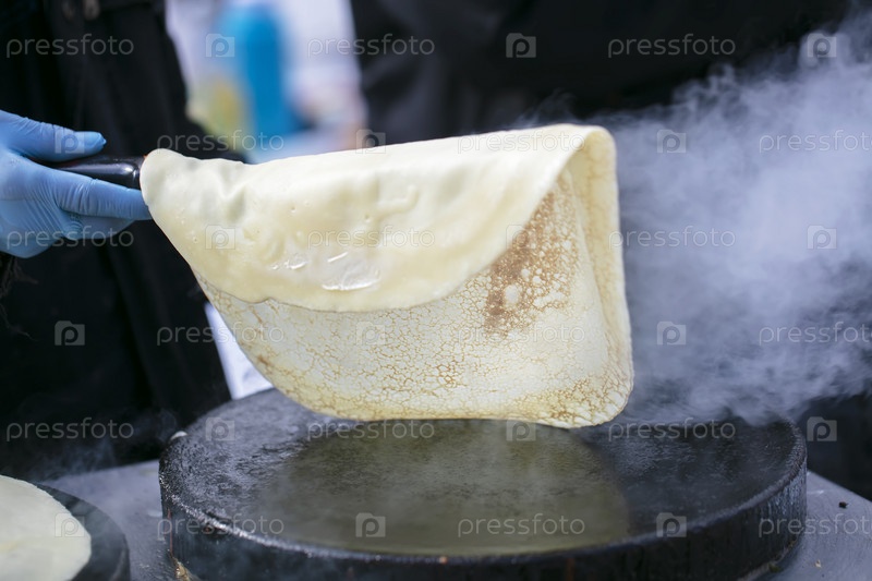 Вылейте тесто для блинов на сковороду. Приготовьте блины