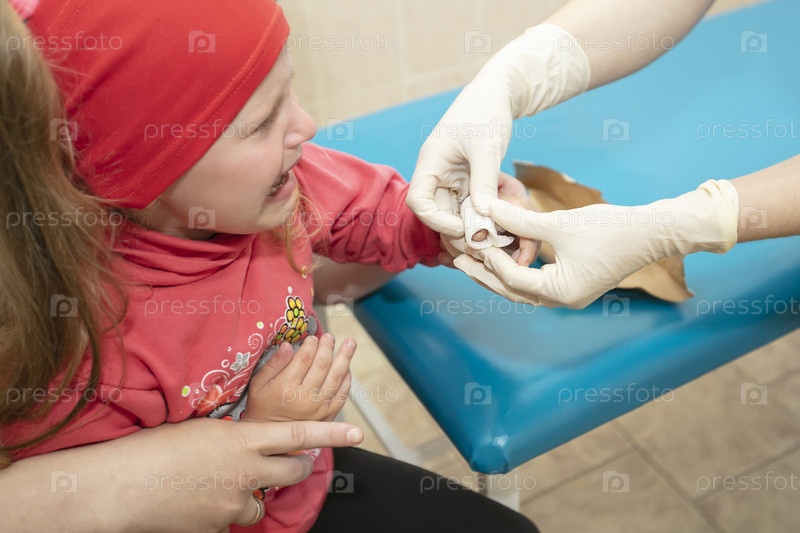Руки врача перевязывают больной палец бинтом ребенка. Травмы и раны на пальце у детей