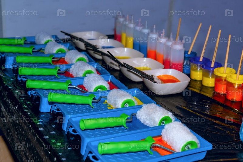 На столе много цветных красок и кисточек. Масштабный рисунок. Краски в тюбиках и тарелках
